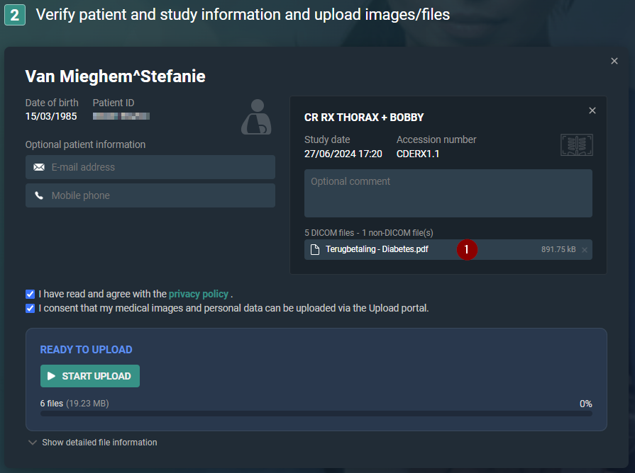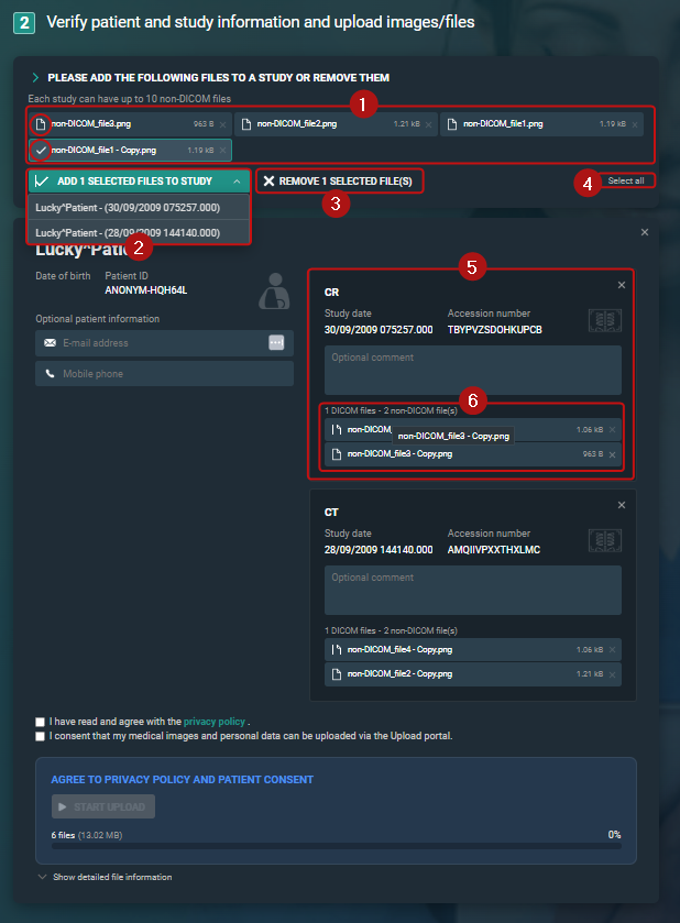 | 6 | Start upload | This button initiates the upload. It is not available until you have agreed to the privacy policy and patient consent. |